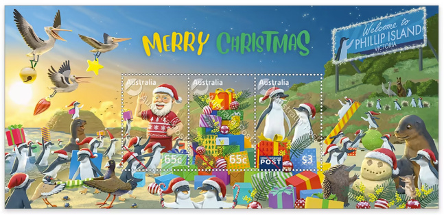 В честь Рождества Австралия выпускает праздничные марки, посвященные визиту Санта-Клауса на остров Филлип, расположенный в штате Виктория. Этот остров, известный своим заповедником дикой природы и знаменитым Парадом пингвинов, находится всего в полутора часах езды от Мельбурна и соединен с материком мостом длиной 640 метров. Остров Филлип – популярное место для однодневных поездок.