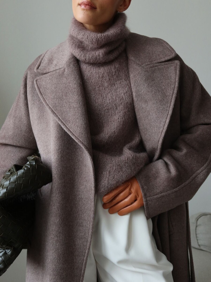 • с деликатной фактурой Даже простой свитер из масс-маркета, если он выглядит мягким, добавляет женственности сильнее любого платья. Самый эффектный прием: комбинировать плотную внешнюю ткань (пальто) и мягкий внутренний слой (свитер, шарф). Конт