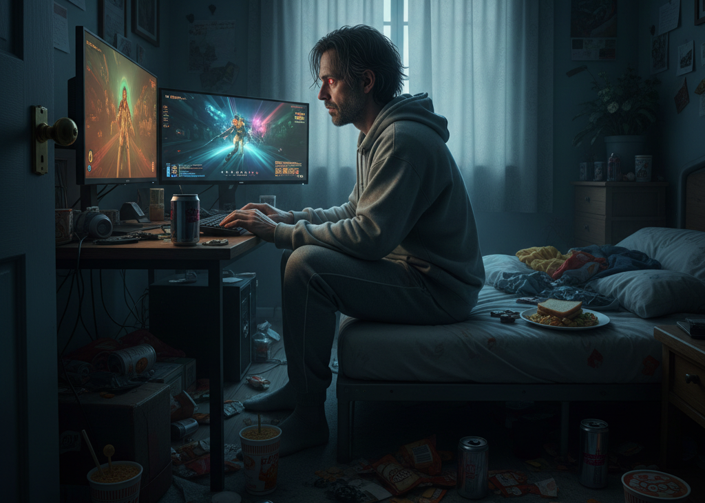 Прошло три года. Максиму тридцать два. Он до сих пор живёт с родителями, не работает, почти не выходит из комнаты. Питается бутербродами, которые мать оставляет у двери. Ночью играет, днём спит. С людьми почти не общается.