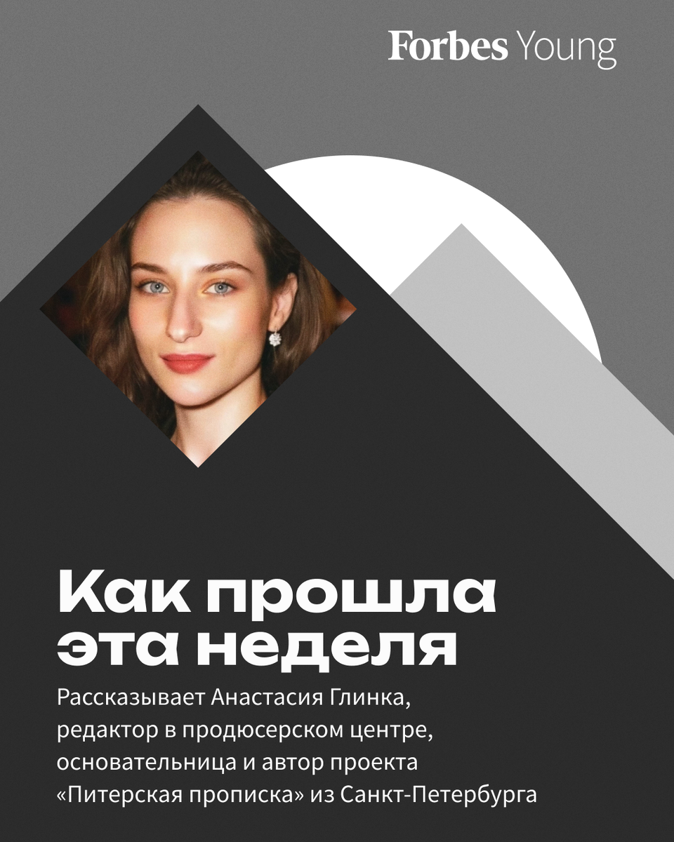 Сегодня в рубрике «Как прошла эта неделя» о своей жизни рассказывает 31-летняя редактор и блогер Анастасия Глинка. Как прошла твоя неделя? Насыщенно! Расписала контент до конца года, организовала два прямых эфира, провела переговоры о первом печатном издании «Питерской прописки», увиделась с близкими. Чем ты занимаешься? Курирую проекты в продюсерском центре: тексты для блогов, сценарии, письма, курсы, соцсети, интервью. Параллельно — веду свой Telegram-канал. Обычно мой день выглядит так: за кофе разбираю почту и сообщения, прописываю задачи на день, завтракаю, потом — работа (тексты, созвоны, тексты). Где-то к пяти вечера я освобождаюсь и занимаюсь задачами личными. Гуляю, пишу книгу, посещаю мероприятия. С чего начался твой путь в профессию? Я всегда писала. Даже на режиссуре в СПбГИКе лучше всего у меня выходили именно сценарии. Работала журналистом и пиарщиком. Второе высшее связано с историей искусств. Ведь все, что интересует современного читателя, уже случалось. Поэ