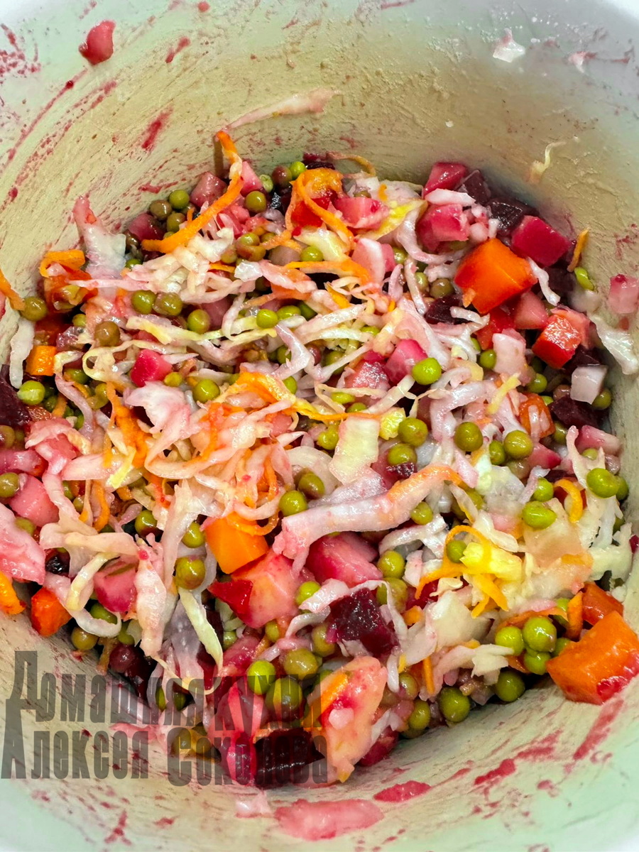 Квашеную капусту в основу не добавляю – ее в свою тарелку в нужном себе количестве каждый добавит сам. Или вообще не добавит, потому что не все любят квашеную. И салат винегрет готовят без капусты тоже 😊