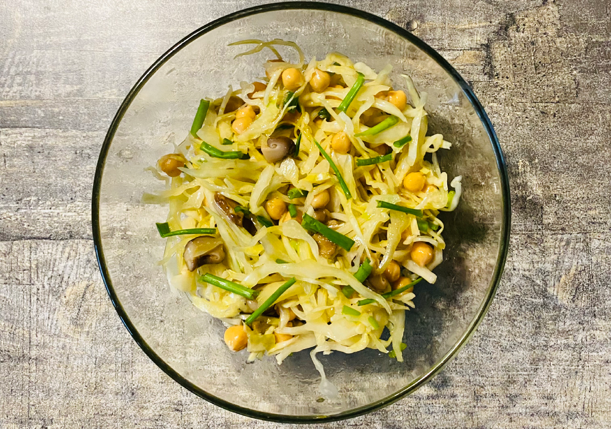 5 слов, которые характеризуют этот салат, вы можете расставить по иерархии важности лично для вас. Готовиться салат за 5 минут. Все продукты можно купить в Магните у Дома. Не промахнетесь с покупкой ингредиентов - капуста только квашенная, грибы - только соленые. Никакого уксуса. «Квашенная капуста имеет низкую калорийность, богата клетчаткой, способствует нормальной работе кишечника, защищает организм от токсинов и вредных микроорганизмов, помогает легче переваривать пищу. Пробиотики и витамин С, находящиеся в квашеной белокочанной капусте, участвуют в профилактике ряда заболеваний и борьбе с ними.» «Горох Нут содержит много антиоксидантов, витаминов и минералов, фолиевую кислоту, магний, витамин В6, витамин С, железо, калий, кальций, фосфор и цинк. Он богат растительным белком и клетчаткой.» Для верующих практически незаменим во время поста наряду с фасолью и обычным горохом - придает блюду сытность. Думаю, пользу всех составляющих вы сами легко найдете в интернете. Приятного аппетит