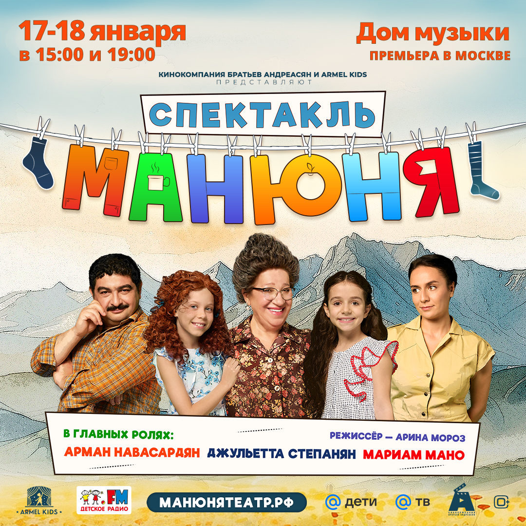 В московском международном Доме Музыки 17 и 18 января зрителей ожидает премьера «Манюни» Арины Мороз, поставленного по детской повести Наринэ Абгарян. В постановке примут участие исполнители главных ролей Ба, мамы Нади и папы Миши в популярном одноименном сериале Джульетта Степанян, Арман Навасардян и Мариам Мано, уточняет пресс-служба спектакля. Арина Мороз получила известность благодаря детским спектаклям «Кентервильское привидение», «Сказки Андерсена» и «Пиноккио». По словам режиссера, «трудно вспомнить другое современное произведение, ставшее настолько популярным, как "Манюня". После книг Драгунского и "Чебурашки" Эдуарда Успенского — это один из самых ярких хитов. У меня двое детей. Старшему сыну я читала "Манюню", книга жила у нас дома. Младшая дочь сначала посмотрела сериал, а потом уже прочла книги. Когда мы только начинали работу над этим проектом, дочка принесла мне три тома и сказала: "Мама, давай скорее делай спектакль, я хочу его посмотреть". Позже, когда начались репетици