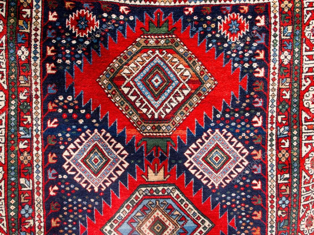 Кахетия: строгая геометрия, ромбы, рубиновые и синие тона, много «зубцов» и чётких линий.