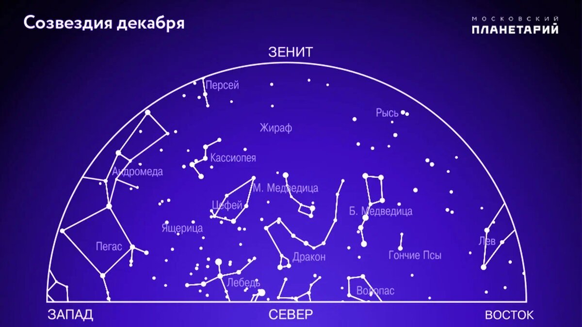 Красиво ночное звёздное небо декабря. В ясную морозную ночь над горизонтом можно увидеть все яркие звёзды зимних созвездий. Месяц самых длинных ночей обычно не балует нас ясной погодой. А ведь именно в декабре можно наблюдать еще один мощный метеорный поток-гигант из созвездия Близнецы – знаменитые Геминиды, превосходящие по количеству «падающих звезд» все остальные ежегодные метеорные потоки, включая августовские Персеиды. В 2011 году он дал всплеск до 200 метеоров в час, что в 2 раза больше Персеид. На востоке восходят Лев и Гидра, а на юго-востоке поднимается к полуночи яркая группа зимних ярких созвездий Возничий, Телец, Близнецы, Орион, Малый Пес и Большой Пес. В полночь в южной области неба сияет созвездие Орион, над ним несколько правее, (западнее) – Телец и ещё выше – Возничий, западнее которого видно созвездие Персей. На юго–востоке сияет созвездие Близнецы, именно из него ожидаем в середине декабря ежегодный звездопад Геминиды. Под ними у горизонта – созвездие Малый Пес и нев
