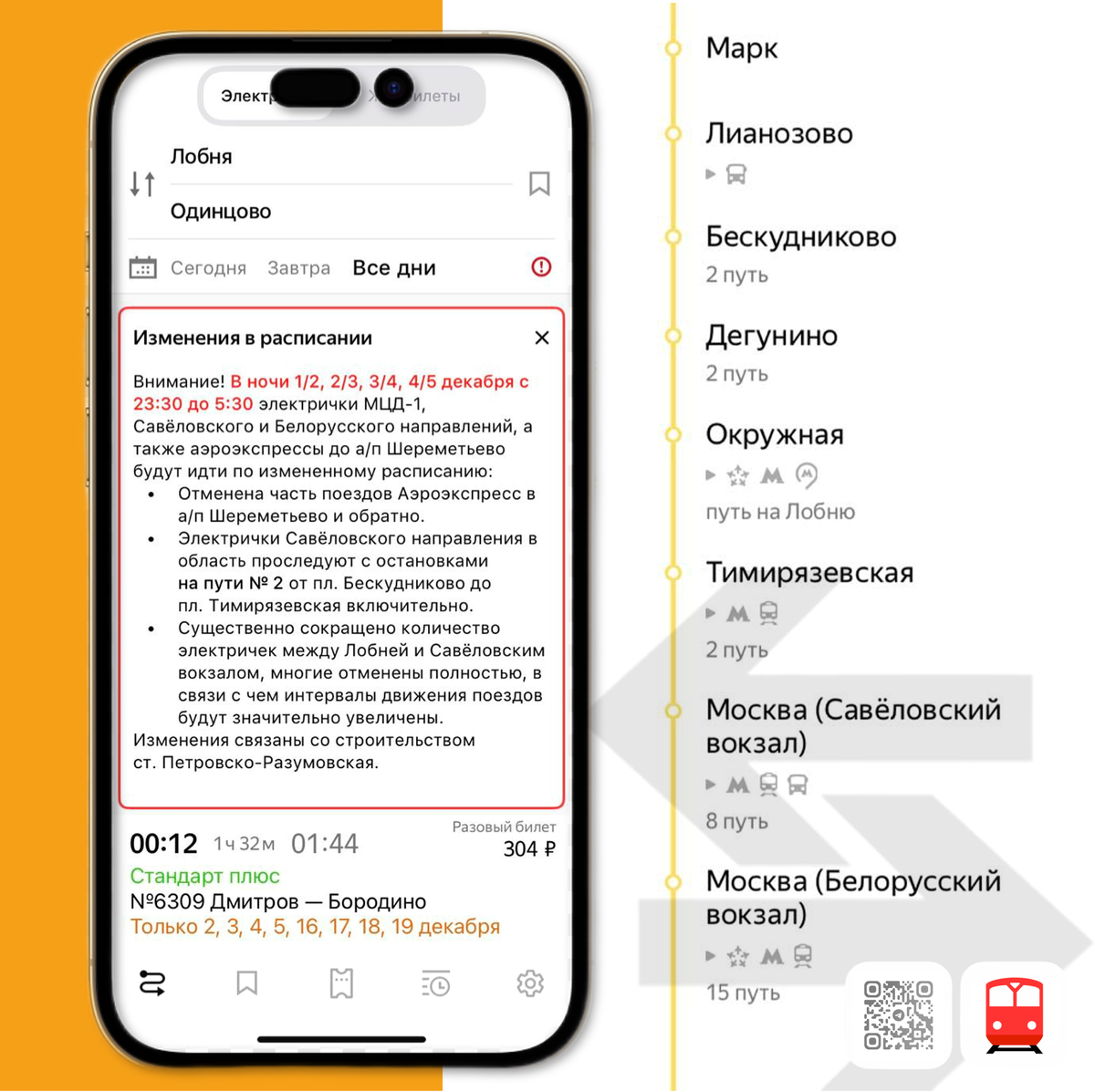 В ночи 1/2, 2/3, 3/4, 4/5 декабря с 23:30 до 5:30 электрички МЦД-1, Савёловского и Белорусского направлений, а также аэроэкспрессы до а/п Шереметьево будут идти по измененному расписанию: ➡️ Отменена часть поездов Аэроэкспресс в а/п Шереметьево и обратно. ➡️ Электрички Савёловского направления в область проследуют с остановками на пути № 2 от пл. Бескудниково до пл. Тимирязевская включительно. ➡️ Существенно сокращено количество электричек между Лобней и Савёловским вокзалом, многие отменены полностью, в связи с чем интервалы движения поездов будут значительно увеличены. Изменения связаны со строительством ст. Петровско-Разумовская. 🔘 Я.Информатор | #МЦД1