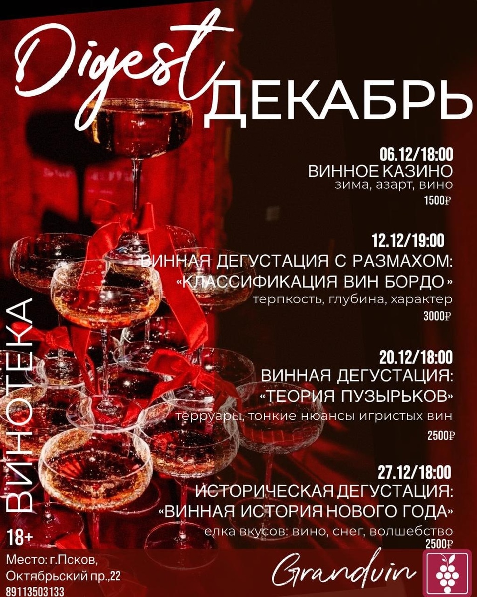 Афиша мероприятий на декабрь бара GrandVin 🍇 🍷 В декабре гостей ждут три увлекательные винные дегустации: масштабная, историческая и посвященная игристым винам. 📍 Октябрьский, 22. Оставайтесь с нами #НашаПсковскаяобласть