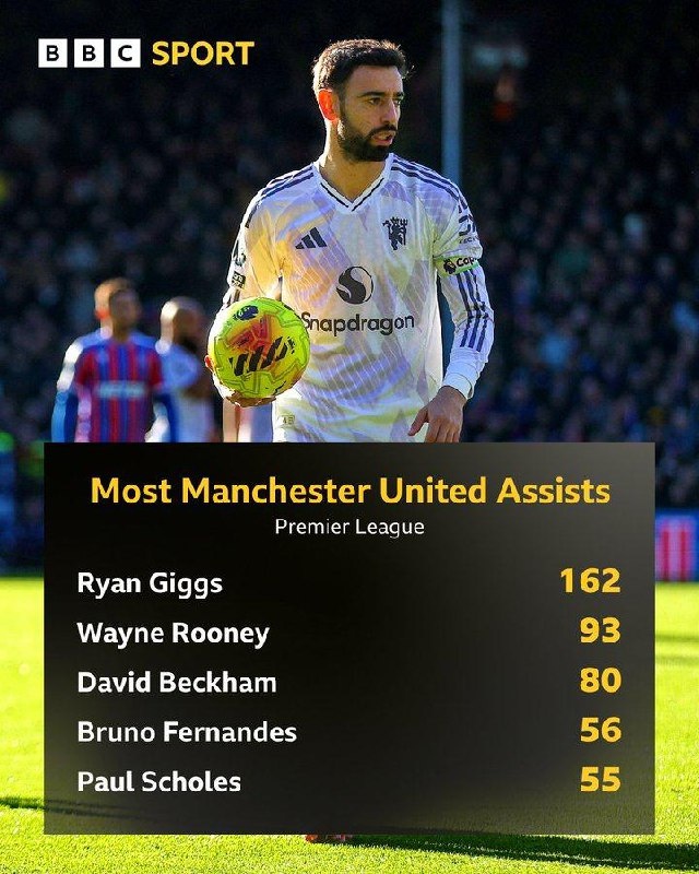 Теперь Бруну Фернандеш — четвертый лучший ассистент "Манчестер Юнайтед" в Премьер-Лиге (56 результативных передач) 📊