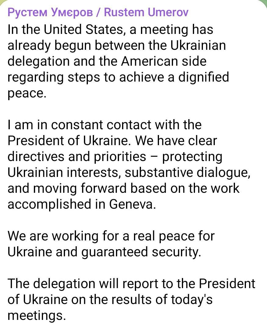 В ответ на пост US-Ukraine Miami meeting NOW UNDERWAY says Zelensky's replacement for Yermak To achieve 'dignified peace' and somehow 'protect Ukrainian interests' UPDATE: Umerov just DELETED his post