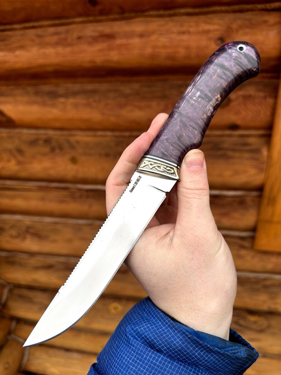 🎣 Лучший нож для рыбака — уже в наличии! Идеален для потрошения и чистки рыбы — специально разработанная форма клинка и анатомическая рукоять обеспечивают максимальное удобство в работе. 🔪 Особенности: - *Сталь S390* — топовая для ножей, долго держит заточку, гарантирует максимально агрессивный рез. - *Серрейтер на обухе* — быстрое и лёгкое снятие чешуи, не нуждается в дополнительном инструменте. - *Рукоять из стабилизированной карельской берёзы* (фиолетовая) — прочная, влагостойкая, приятная в руке. - *Анатомическая форма* — минимальная усталость даже при длительной работе. - *Бритвенная заточка* — острота с первого касания. - *Твёрдость клинка* — 70 HRC, износостойкость без компромиссов. - *Пожизненная гарантия* на отсутствие производственных дефектов — качество подтверждено 20-летним опытом и мастером третьего поколения. 💼 В комплекте — ножны из натуральной кожи. Можно заказать *формованные ножны* (+8 000 ₽). Цена: 28 000 ₽ 🛒 Для заказа — пишите в Telegram: [@Nazarklinokbot](h