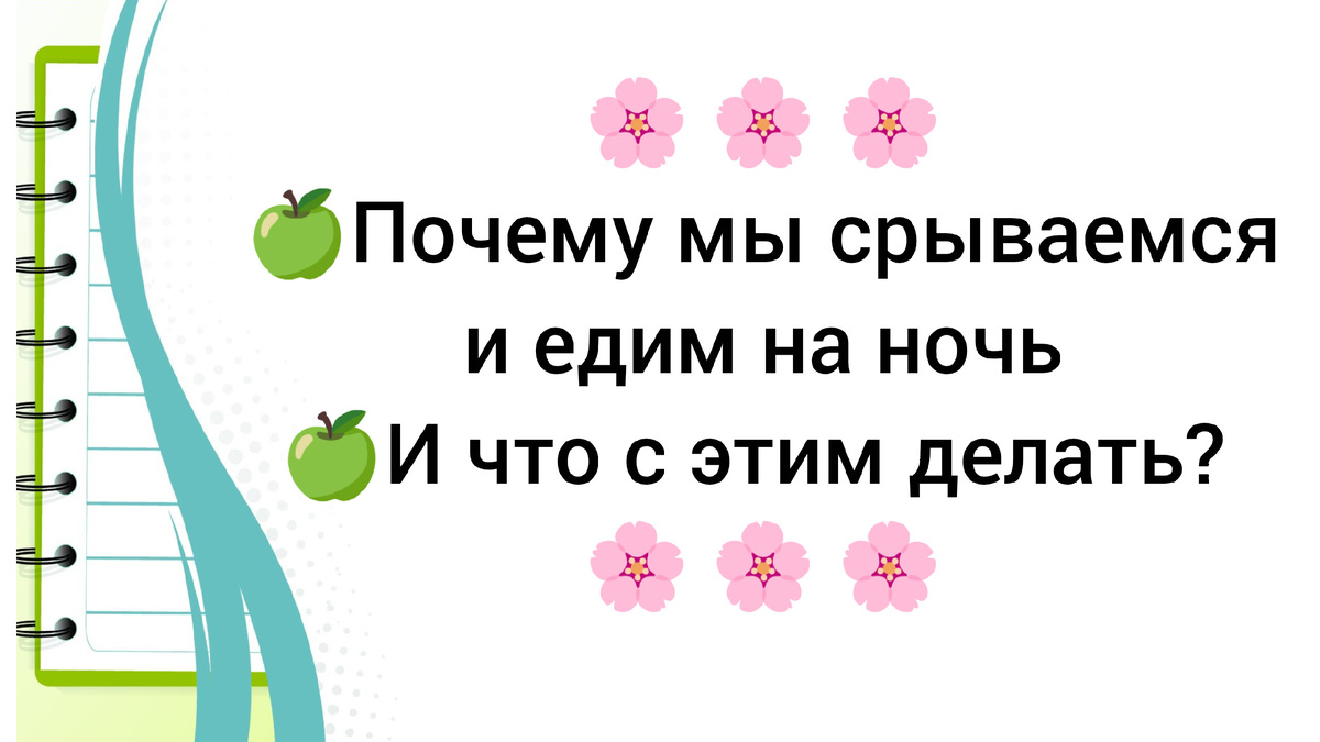 🍏Почему мы срываемся и едим на ночь и что с этим делать? Скажите, когда еда кажется вам особенно вкусной? Во время завтраков, обедов, ужинов или поздним вечером и после полуночи, когда бутерброды и булочки превращаются в шедевр гастрономического искусства? Наверняка вы помните «главный секрет стройности» про не есть после 6, но на самом деле это — миф. Если человек целый день почти не ел, то поужинать на ночь рекомендуется и ни в коем случае не испытывая при этом чувства вины. Ночной перекус становится проблемой только в двух случаях: 1️⃣Вы хаотично питались весь день и закидывали в себя в перерывах между приемами пищи шоколадки, булочки и прочие снеки. 2️⃣Ночные путешествия к холодильнику повторяются снова и снова. 🍏Причины у такого пищевого поведения могут быть следующими: 🌀Хроническая усталость. То есть в еде мы черпаем энергию, которую больше, кажется, взять негде. 🌀Стрессы. Во время нервного напряжения именно еда помогает нам добрать эндорфинов и остаться на плаву. 🌀Нех