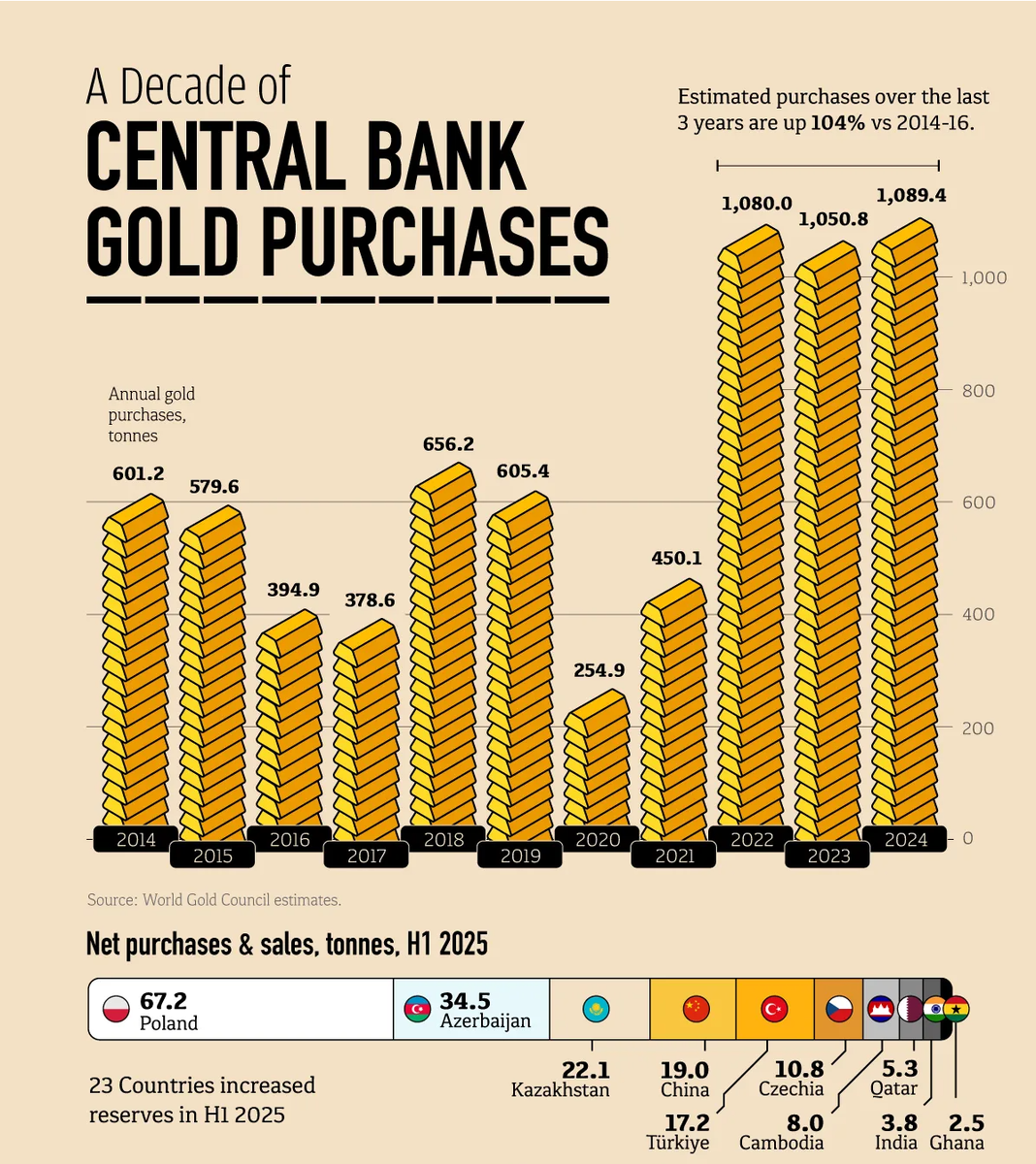 За период с 2014 г. по 2024 г. динамика официального сектора в отношении золота изменилась фундаментально. После умеренного темпа в середине 2010-х покупка золота ускорилась после 2018 г., временно замедлилась в 2020 г., затем перешла в фазу устойчивого спроса свыше 1000 тонн ежегодно в 2022–2024 гг. Сдвиг в масштабах заметен: за 2014–2016 гг. центральные банки приобрели 1575.7 тонн, а за 2022–2024 гг. уже 3220.2 тонн. Статистика подтверждает, что после периода мягкой инфляции и относительной политической стабильности мировая экономика вошла в цикл, где золото вновь стало стратегическим активом для государств. Масштаб покупок последних лет фактически удвоил предыдущий десятилетний цикл. Данные по отдельным годам закрепили этот тренд. 2018 г. стал поворотным моментом с объёмом 656.2 тонн, а в 2020 г. покупки просели до 254.9 тонн. Уже в 2022 г. спрос вырос до 1080 тонн, в 2023 г. составил 1050.8 тонн, а в 2024 г. достиг 1089.4 тонн. Для центральных банков это был ответ на структурные из