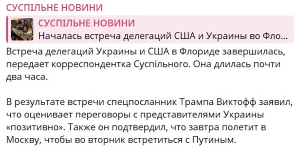 По украинцам американцы закончили. Ждем утечек из европейских СМИ. Важно будет то, прилетит ли Уиткофф один или с зятем Трампа — Кушнером. Кушнер не занимает какой-либо должности в администрации Белого дома, он просто зять. Однако его участие — это показатель, на какой стадии находятся переговоры. Если он будет в Москве, значит, достижение договоренностей очень близко.