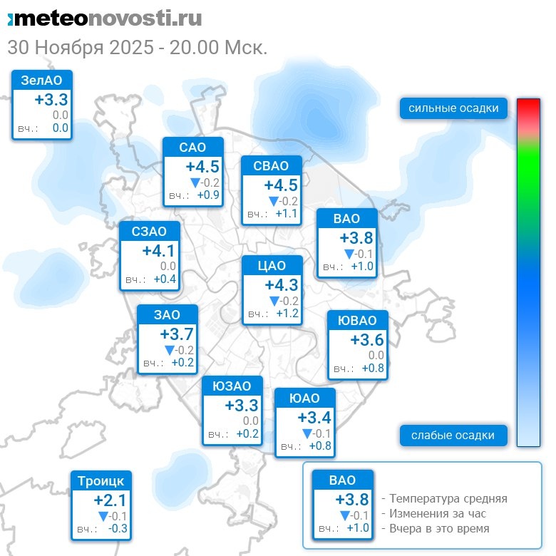 В 20:00 в Москве было от +2.6°C до +4.6°C, средняя температура +3.8°C #погода #Москва #осень #температура #30ноября #воскресенье