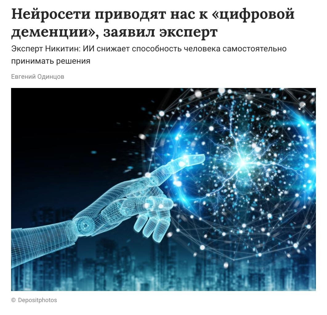 ИИ может довести до цифровой деменции и цифрового слабоумия. Вроде бы боты берут на себя рутину, а вроде это не очень хорошо. Доверяешь ИИ? Cпособность к самостоятельным решениям становится меньше. Короче говоря, тренируйте мозги почаще и развивайте механизмы поиска и принятия решений. Не впадайте в зависимость от подсказок. @lobushkin