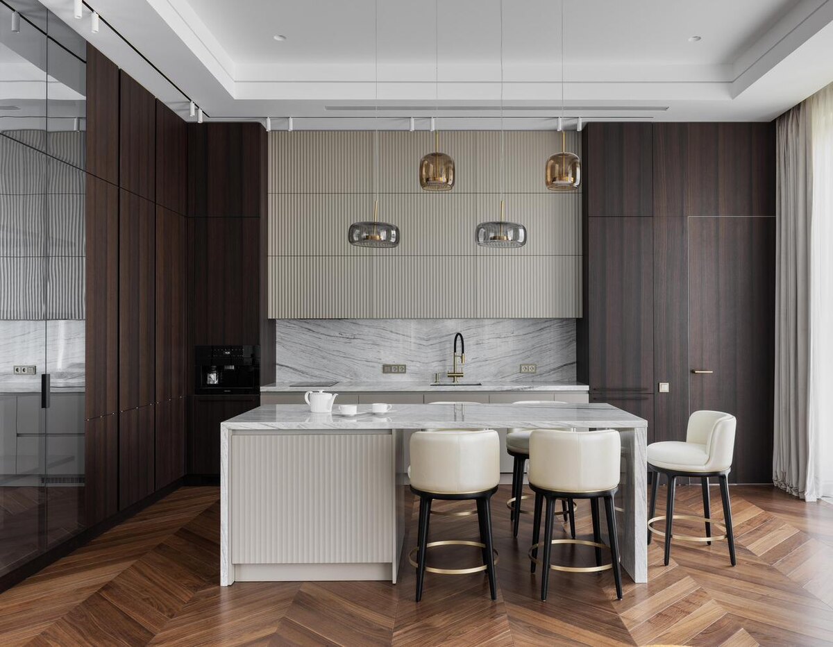 Современные интерьеры уходят от привычного представления о кухне как о рабочей зоне. Сегодня это часть архитектурного пространства дома — цельная, спокойная, с продуманной геометрией и премиальными материалами. Проект Giulia Novars в Agalarov Estate — яркий пример такого подхода. Архитектурная цельность Вертикальные плоскости из дубового шпона Termico формируют основу интерьера. Благодаря им стеновые панели, колонны хранения и скрытая дверь, ведущая в техническую кухню, воспринимаются как единый монолит. Такой приём создаёт ощущение дорогого, спокойного пространства, в котором нет визуального шума. Фасады волной как художественный жест. Главным выразительным элементом стали навесные шкафы с фасадами-волнами в отделке матовая эмаль. Бархатистая поверхность и мягкие, скульптурные линии задают интерьеру рельефность и подчёркивают игру света. Это не просто дизайн — это пластика, которая работает на атмосферу. Тонкость материалов и технологий. Мраморная столешница и фартук образуют цельную