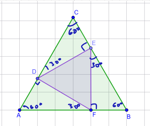 б) Найдите отношение площади этого треугольника к площади исходного Сделаем чертеж и укажем все углы Тогда очевидно, что все углы в фиолетовом треугольнике равны 60 градусам Чтобы решить пункт б, достаточно знать отношение сторон Как мы знаем отношение площадей равно квадрату отношения сходственных сторон Буду рада вашим лайкам, комментариям и подписке на канал Спасибо за внимание, до новых встреч