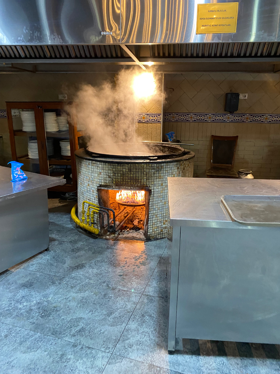 В огромных казанах повара готовят плов - в каждом большом казане - свой вид - свадебный, Самаркандский, чайханский, девзиру … - всего 5 видов плова. Цены - от 46 до 57 тысяч сумов за порцию ( 300-400 рублей).