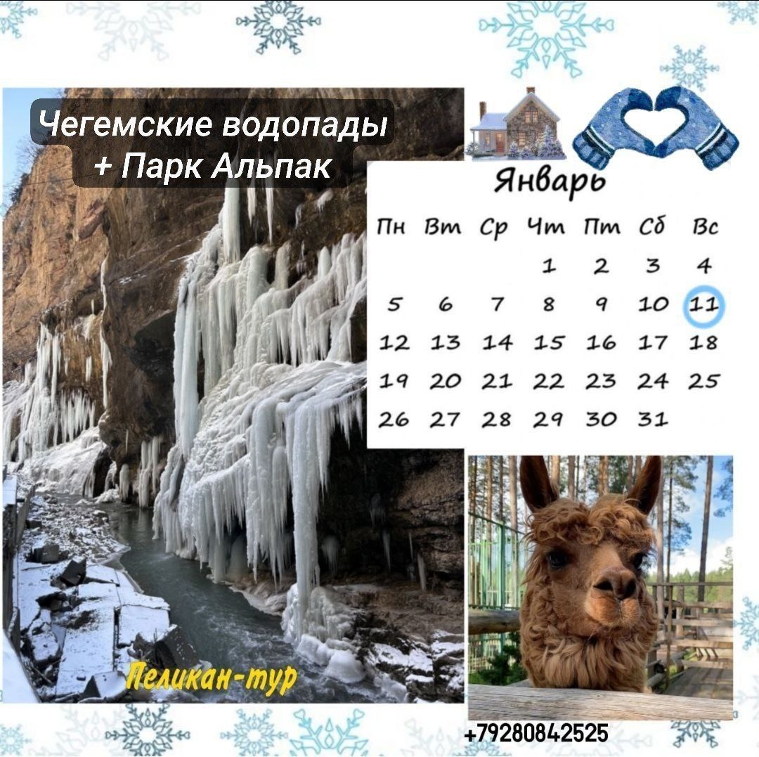 💙💙💙💙💙💙 💙💙💙💙💙💙💙💙💙 💙💙💙💙💙💙💙💙💙 🦙💙💙💙💙 💙💙💙💙💙💙🦙 ❄️ Зимние каникулы — время приключений и ярких впечатлений! А где их лучше всего завершить? Конечно, в одном из самых красивых мест — Чегемские зимние водопады и парк альпак! Чегемские водопады — это одна из самых живописных природных достопримечательностей Кавказа. Зимой водопады превращаются в яркие ледяные скульптуры, сверкающие на солнце и создающие волшебную атмосферу. 📱 Это отличное место, чтобы расслабиться, зарядиться энергией и получить незабываемые впечатления в окружении красоты Кавказа. В парке Альпак можно подружиться с Альпаками, они очень дружелюбные и спокойные, они отлично чувствуют себя в окружении людей и с радостью идут на контакт. Эти животные — настоящие мастера позирования: благодаря своему доброжелательному нраву и милой мордашке, они часто становятся звездными героями фото. 🦙 📆Дата: 11.01.2026 💙Время: 10:00 🔆Цена: 1000 руб с человека, включён трансфер туда и обратно 📌Допол
