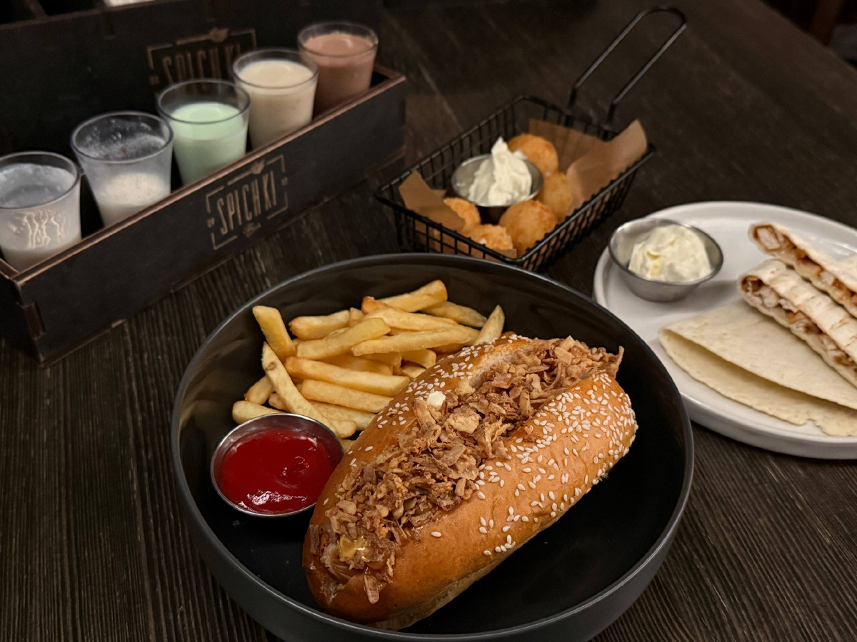 - Классический хот-дог – 600 рублей. Подается с картошкой фри. Огромная булка, которая создаёт объём и впечатление, что блюдо очень сытное. Внутри – жареный лук и лук BBQ. Последнее спорно – мягкий лук, нарезанный длинными полосками в большом количестве. И хотя сочетается со всем остальным прекрасно, всё же классическим такой вариант я бы не назвала. Колбаска куриная, небольшая, но съедобная. Соусы чесночный айоли и горчичный. Количество айоли мне показалось избыточным, возможно, вкусовщина. В целом, от хот-дога впечатления скорее положительные, это не шедевр кулинарного искусства, но хороший «среднячок» за свои деньги. Картошка фри хрустящая. Сочетание с кетчупом хоть и подзабытое, но беспроигрышное.