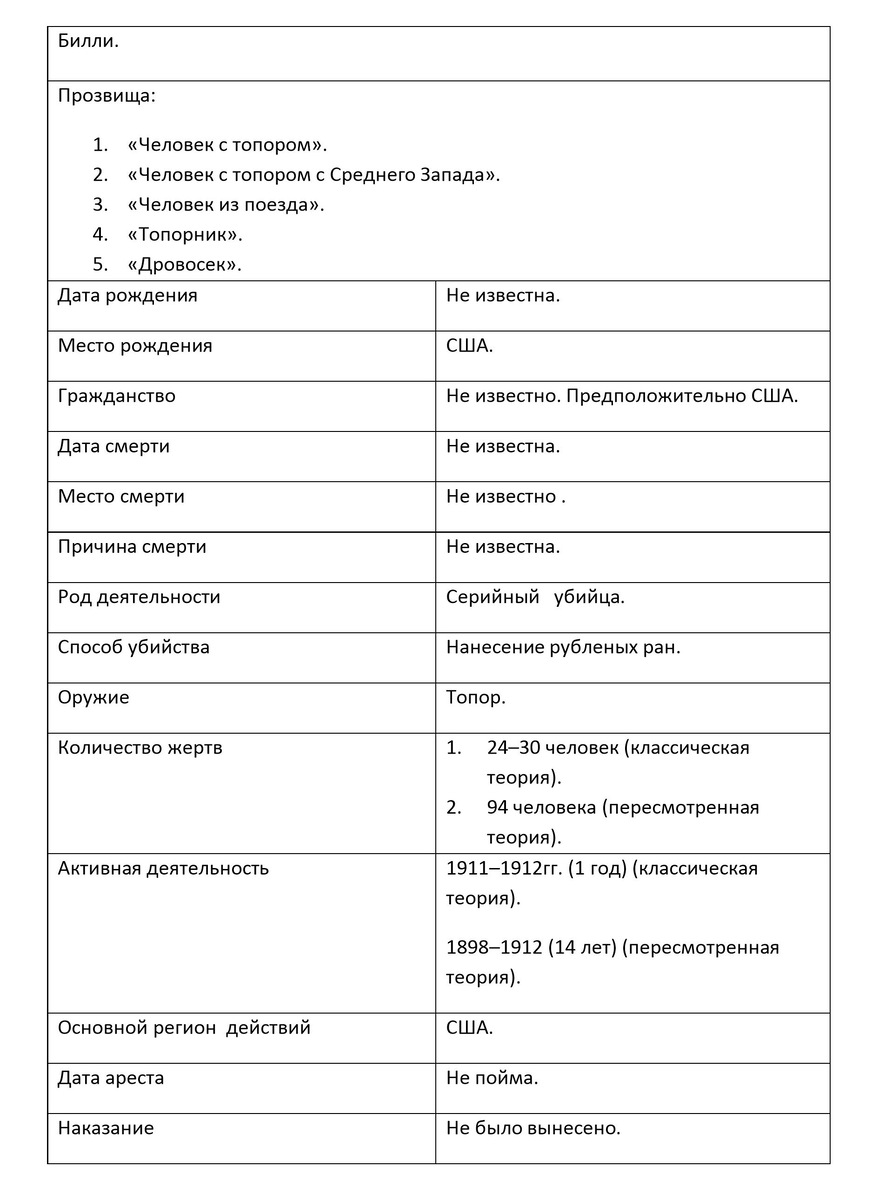 Билли -«Дровосек» (также известный как «Человек с топором», 2. «Человек с топором с Среднего Запада», и «Человек из поезда» ). Под этим именем св историю преступлений попал некий подозреваемый в серийных убийствах, виновный в серии убийств членов семей, произошедших в основном на Среднем Западе США в период с сентября 1911 по июнь 1912 года.