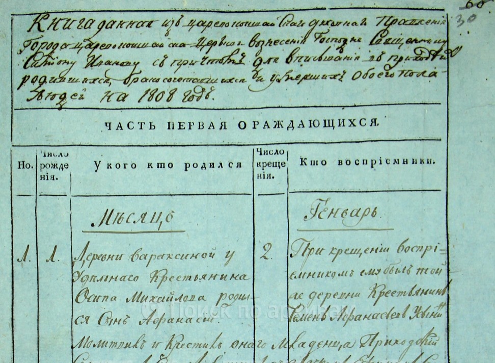 Метрические книги церквей г. Царевококшайск, Царевококшайского уезда, Чебоксарского округа для записи родившихся, бракосочетавшихся, умерших. 1 января 1808 — 31 декабря 1808. Государственный архив Республики Марий Эл (ГАРМЭ), фонд № 305, опись № 2, дело № 138, стр. 54. Книга данная из Царевококшайского духовного правления города Царевококшайска церкви Вознесения Господне священнику Симиону Иванову с причтем для вписывания в приходе родившихся, бракосочетавшихся и умерших обоего пола людей на 1808 год. Часть первая. О родившихся. Стр. 63. Месяц октябрь. № 28. 1 числа. У рабочего Алексея Петрова родилась дочь Палагея. Крещена 4 числа. Восприемницей была Секретарская жена Афросинья Балахонцева. https://yandex.ru/archive/catalog/187392e2-38f4-48b3-b25a-a533fc8887cf/63