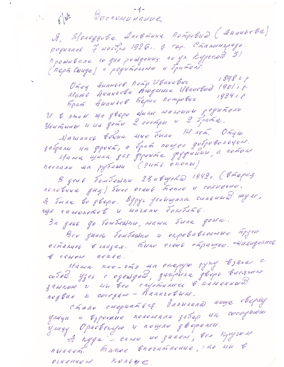 Воспоминания Молодцовой (Ананьевы) Алевтины Петровны
