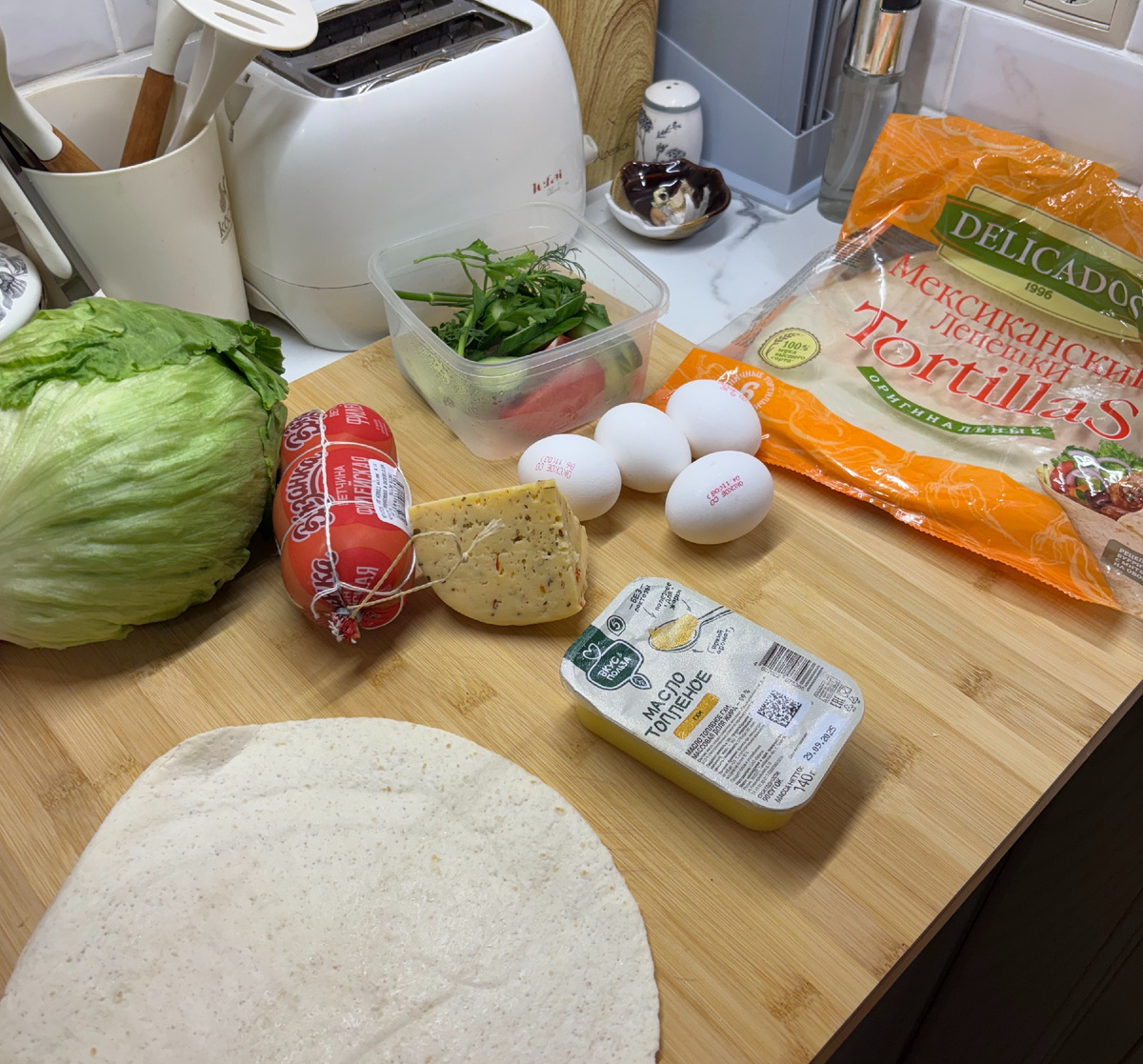Здравствуйте мои дорогие подписчики и гости моего канала! Рубрика "А что на завтрак?" и у нас снова новый легкий рецепт, который можно приготовить утром. Сегодня предлагаю вам очень быстрый и вкусный рецепт тортильи. Тортильи на завтрак бывают двух видов. В одном случае, тортильей называют мексиканскую лепешку из пшеничной или кукурузной муки. В нее мексиканцы заварачивают все, что есть на данный момент в холодильнике. Тортильи-лепешки - традиционная часть в приготовлении знаменитых мексиканских буррито. Испанцы называют тортильями омлет с картофелем, который подают на завтрак. Мы к нему вернемся чуть позже, а сейчас предлагаю последовать примеру мексиканцев и приготовить тортильи с яйцом и ветчиной. Такие лепешки с начинкой можно подать на завтрак или ужин, как быстрый перекус или детям в школу. Итак, поехали! Для этого блюда нам понадобится(на 1 порцию): Вы можете использовать те продукты, что есть в холодильнике, например колбасу, помидоры, любимый соус или другие ингредиенты по