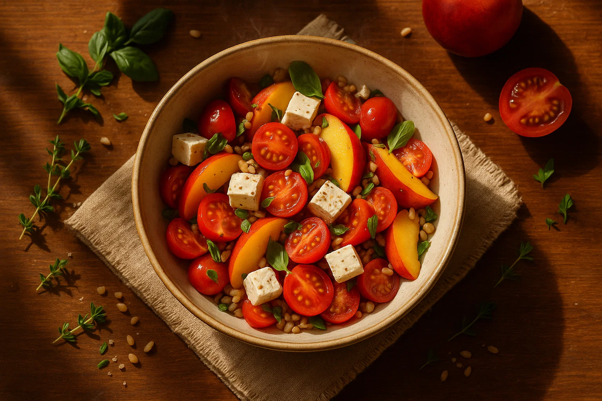 Что нужно: нектарины, помидоры, фета, рукола, масло, бальзамик. Как делаю: всё нарезаю и смешиваю. Фишка: добавить немного мёда в заправку — вкус округлится.