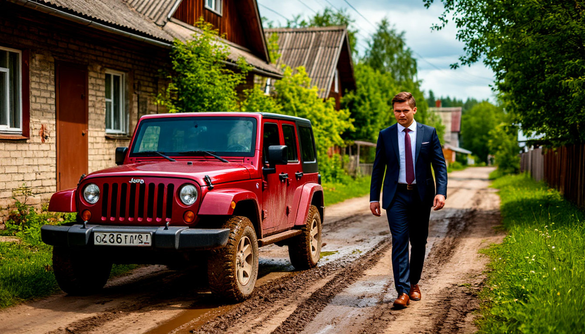 За окном послышался шум машины. Во двор въехал тёмный джип — тот самый красный, о котором говорила Вера Ивановна. Только теперь он был серо-грязный от дождя.