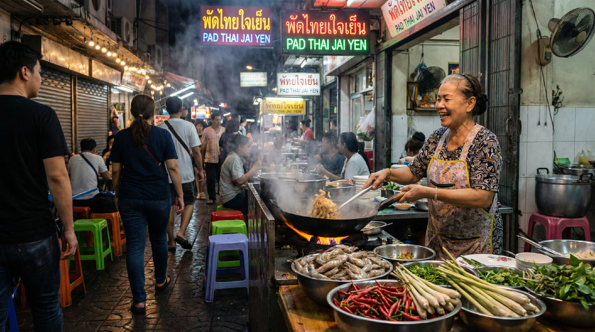 Я всегда считала, что люблю Том Ям. Пробовала его в десятках паназиатских ресторанов у себя на родине: где-то было поострее, где-то покислее, но в целом вкус был знакомый и понятный. Но я даже не подозревала, какой на самом деле должна быть эта огненная феерия в тарелке. До одной поездки в Бангкок. Моей идеей фикс было найти “тот самый”, настоящий, аутентичный Том Ям. Не туристическую версию, адаптированную для нежных европейских желудков, а тот, что едят сами тайцы. Я спрашивала у местных, читала блоги, и все дороги вели меня прочь от блестящих ресторанов в торговых центрах. Они вели в запутанные, шумные и, честно говоря, не самые чистые переулки. И вот, в одном из таких переулков, среди грохота мопедов и густых запахов жареного, я увидела ЕЁ. Крошечная уличная кухня на колесах. За ней колдовала миниатюрная тайская женщина неопределенного возраста. В ее арсенале был всего один гигантский вок, почерневший от времени, и горы свежайших продуктов: креветки, грибы, связки лемонграсса, перч