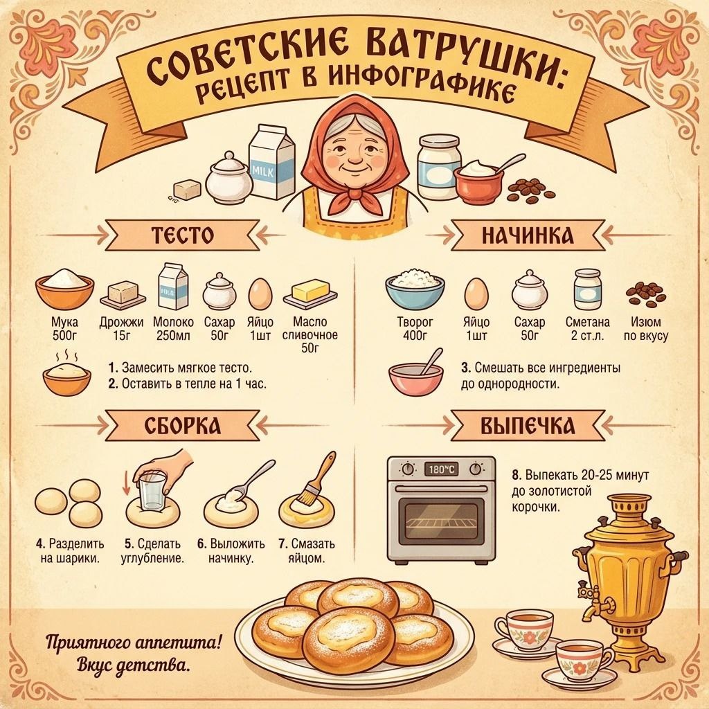 Новая Nano Banana — это восторг 😍 — понимает, что такое «тёплая иллюстрация» — понимает суть темы — пишет по-русски без ошибок и опечаток — даже «вкус детства» в конце написала — хотя есть и нюансы: milk и дрожжи в виде куска масла, но это не критично