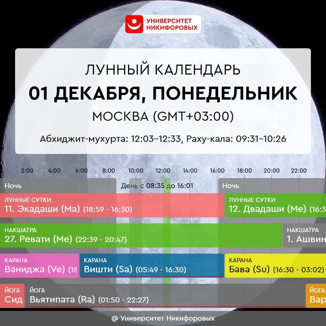 1 ДЕКАБРЯ, ПОНЕДЕЛЬНИК Энергетика дня мягкая, но с ноткой огонька, которая добавляет легкую динамику и помогает справляться с небольшими задачами. Это удачное время для коротких дел, не требующих особой концентрации или напряжения, а также для тех, что можно выполнить быстро. Если у вас есть проекты, которые давно ждут завершения, сегодня благоприятный момент, чтобы довести их до конца. На психическом уровне может ощущаться больше скованности и напряжения, что может отразиться на общем самочувствии и настроении. В такие моменты особенно полезно прибегнуть к природным методам расслабления. Хорошей поддержкой станут травяные чаи, такие как ромашка, мелисса, мята, которые помогают успокоить нервы и снять внутреннее напряжение. Сегодня Экадаши – время для разгрузки и поста: желательно хотя бы отчасти облегчить свой рацион, отказавшись от зернобобовых и продуктов животного происхождения кроме молочным. Время после 16:31 более благоприятно, но все же в большей степени располагает к от