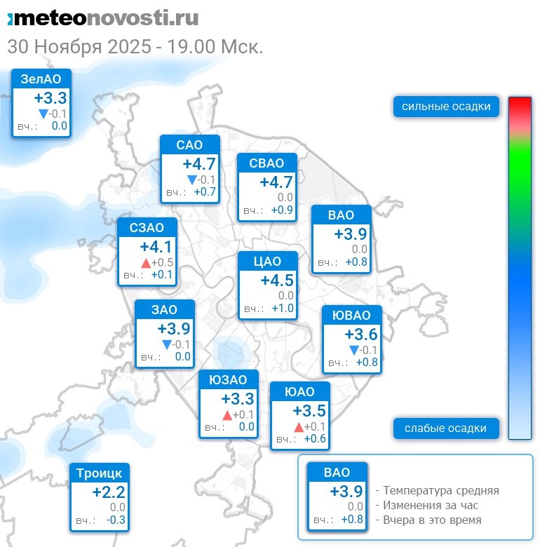 В 19:00 в Москве было от +2°C до +4.8°C, средняя температура +3.9°C #погода #Москва #осень #температура #30ноября #воскресенье