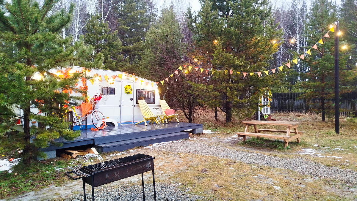 В продолжение темы необычных гостевых домиков хочу рассказать ещё об одном - домике на колёсах. Как обычно, наткнулась на него в интернете совершенно случайно и впечатлилась этой идеей. Домик-фургончик поставлен на большой закрытой территории, прямо на опушке леса. Территория украшена и продумана до мелочей. Для любителей фотосессий здесь множество фотозон. Причем, они соответствуют времени года. Я побывала здесь осенью, застала ещё осеннюю тему, а буквально через пару недель здесь уже совсем другая атмосфера - новогодняя! Можно посидеть у костра, можно сделать шашлыки (есть мангал, дрова и решётка), с собакой приехать тоже можно! Теперь покажу сам домик. Очень уютный и стильный. Санузел тоже предусмотрен: Темнеет осенью рано, и вечером всё здесь превращается в сказку. Домик позиционируется как четырёхместный. Ну не знаю... вчетвером, мне кажется, будет тесно и неудобно. Особенно в холодное время года. Ведь чтобы разложить вторую кровать придётся убирать обеде