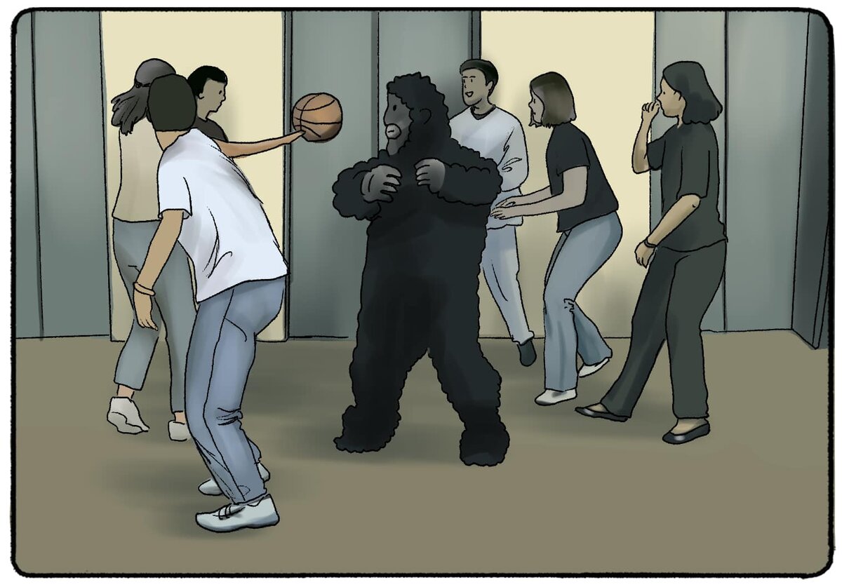 Но в середине ролика происходит абсурдная, почти комичная сцена: в кадр спокойно заходит человек в костюме гориллы. Он проходит между игроками, останавливается, несколько секунд бьёт себя в грудь, а затем так же спокойно уходит. И вот ключевой момент: половина участников не заметили гориллу вообще. Они смотрели прямо на экран, но их внимание было настолько поглощено задачей, что мозг не зарегистрировал этот очевиднейший объект.