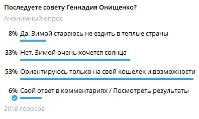 В ответ на пост Подведем итоги опроса по поводу рекомендации Геннадия Онищенко, отказаться от поездок в теплые страны на Новый год – мол, акклиматизация, можно заболеть. Готовы поддержать бывшего главу Роспотребнадзора лишь 8%. Примерно треть проголосовавших считает, что ехать можно и нужно – зимой в России очень не хватает солнца. Большинство же участников опроса уверено – ориентироваться нужно не на время года, а на свой кошелек и возможности: «Купил билеты в Китай и на Фукуок. Потом чтобы охладиться – в Южную Корею. Всё норм»😎 @tourdom