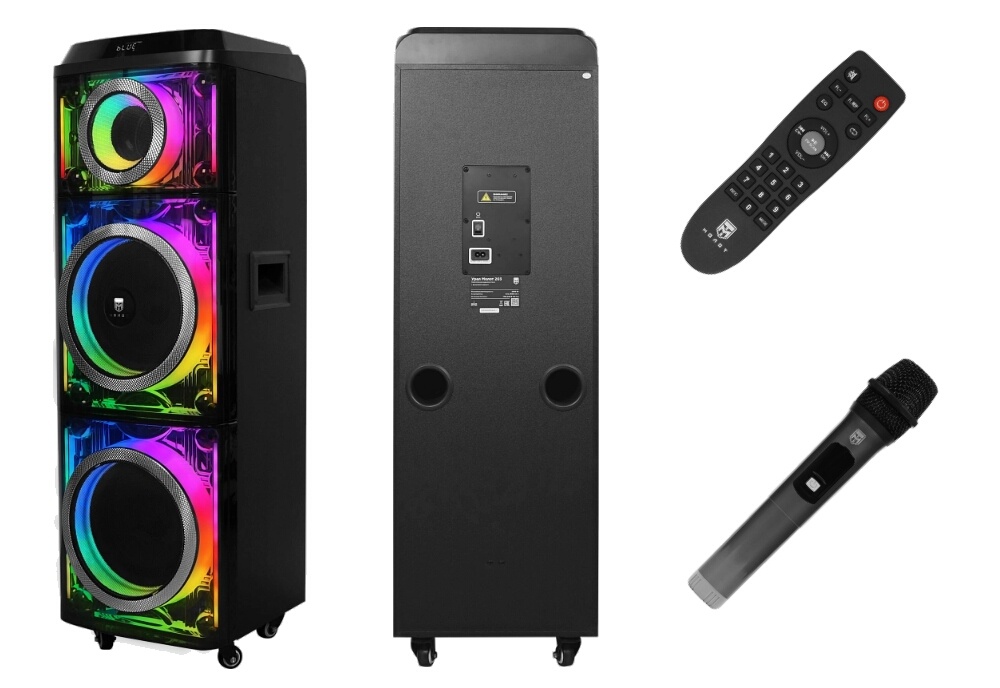 Аудиосистема МОЛОТ 203 – это громкая музыка со световыми эффектами «здесь и сейчас». Два восьмидюймовых динамика гарантируют высокую громкость, гелевый аккумулятор (12 В, 9 А) обеспечит работу даже там, где нет розетки – до 10 часов при средней громкости, и может зарядить телефон. Помимо воспроизведения музыки с флеш-накопителя или по каналу Bluetooth 5.0, предусмотрен режим караоке с поддержкой эффектов (эхо, задержка, приоритет). В комплект входит беспроводной микрофон и пульт дистанционного управления. К колонке можно подключить два проводных микрофона и электрогитару, а результат можно «не отходя от кассы» записать на карточку MicroSD или USB накопитель. К линейному входу можно подключить любой аналоговый источник звука. Две колонки можно объединить в стереопару TWS (True Wireless Stereo), причём вторым компонентом могут быть колонки МОЛОТ 103 и МОЛОТ 213. И вишенкой на торте – радиоприёмник диапазона FM. В аудиосистеме установлены два восьмидюймовых динамика и твитер калибра 1 дю