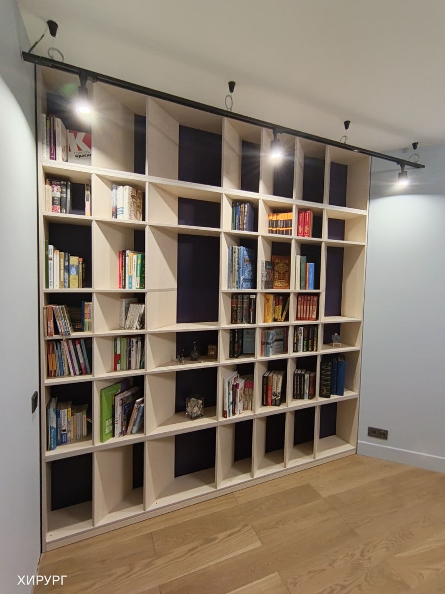 г. Долгопрудный Стеллаж. Материал: Березовая фанера 15 мм. Отделка: Белая морилка. Вертикальные панели под углом 48 градусов. Проверка каждой стороны стеллажа на устойчивость.