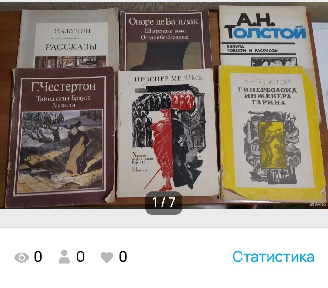 Доброго здоровья читающим. Продались книги. Изданы в СССР. Фантастика Алексея Толстого, детективы Генри Честертона, лирическая проза Бунина, историческая проза Проспера Мериме. И Бальзак. Печатались большими тиражами, очень бюджетные, потому что формат журнальный, бумага газетная, шрифт мелкий. Сохранились плохо, состояние на троечку. Но! Их заказали моментально после размещения при нуле просмотров. Я не знаю как это возможно, но это так. Заказ молчаливый , с покупателем в переписку я тоже вступать не стала, просто отправила на следующий день. Объявление не снимала до тех пор, пока заказ не забрали. Вот финальные цифры просмотров: их восемь, и нет не переписок, не сердечек. Книги были отправлены 5post. Забрали сразу. Общения так и не было. Но главное, что книги кому-то пригодились. Интересная продажа.