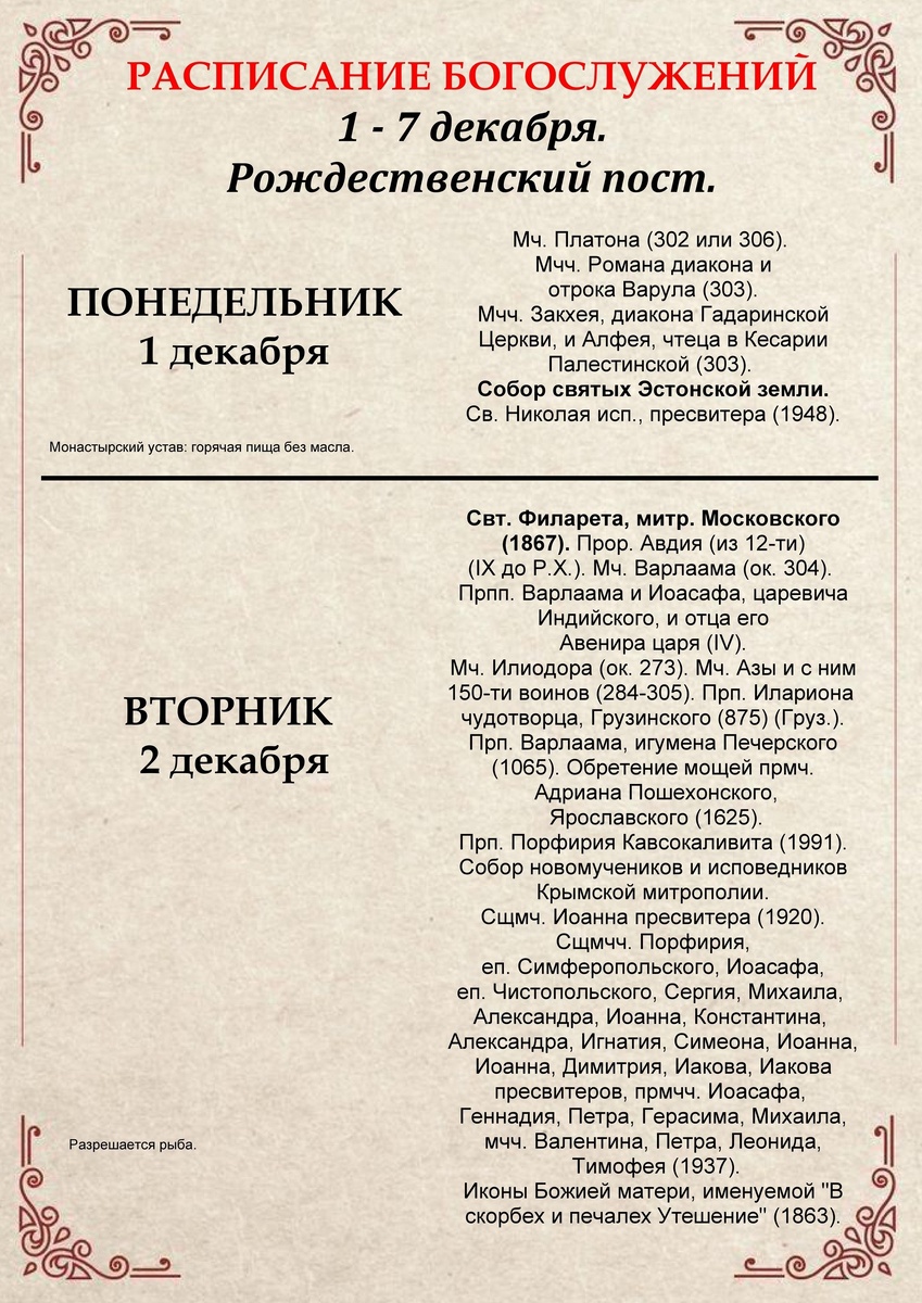 🌹🌿🌺 1 - 7 декабря. Рождественский пост 🌺🌿🌹 💐СРЕДА 3 декабря Вечернее богослужение: 16.00 💐ЧЕТВЕРГ 4 декабря - Введение во храм Пресвятой Владычицы нашей Богородицы и Приснодевы Марии. Акафист: 7.00 Молебен: 7.30 Литургия: 8.00 💐ПЯТНИЦА 5 декабря ПАРАКЛИС Канон молебный ко Пресвятой Богородице: 16.00 💐СУББОТА 6 декабря - Блгв. вел. кн. Александра Невского, в схиме Алексия. Литургия: 8.00 по окончании панихида Вечернее богослужение: 16.00 💐ВОСКРЕСЕНИЕ 7 декабря Акафист: 7.00 Молебен: 7.30 Литургия: 8.00 ✅ Подписаться l Мы в Max