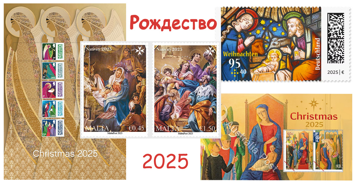 Королевская почта отмечает Рождество 2025 года выпуском набора из 5 марок с иллюстрациями британской художницы Полы Доэрти. На этих иллюстрациях изображены ключевые персонажи рождественской истории: Мария, Иосиф, пастухи, волхвы, ангел и младенец Иисус.