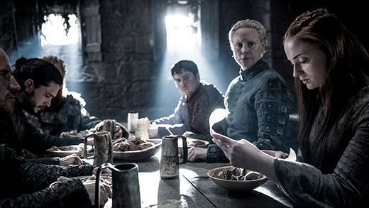 Сегодня мы рассмотрим сцену с письмом от Рэмси. Я собираюсь разбить сцену на два поста. Для начала давайте поговорим обо всех участниках сцены и о том, где они находятся за столом. Эдд, Джон и Тормаунд находятся с одной стороны стола, Тормаунд слегка повернут внутрь, больше сидя верхом на скамье, на которой он сидит, чем прямо. Санса, Бриенна и Под находятся на противоположной стороне. Стоит отметить, что режиссер никого не «соединил», то есть Джон и Санса не находятся прямо напротив, как и Бриенна и Тормаунд. У нас есть группа из Черного Замка с одной стороны и беженцы с другой. Сцена начинается с крупного плана куска серого, неопознанного мяса на вилке Сансы. Но на самом деле сцена связана со знаменем Дома Болтонов, въезжающих в Черный Замок. Крупный план с изображением содранного человека приводит к резкому переходу к мясу. Затем мы видим крупным планом Сансу и Бриенну на заднем плане, внимание зрителей и Бриенны приковано к Сансе.