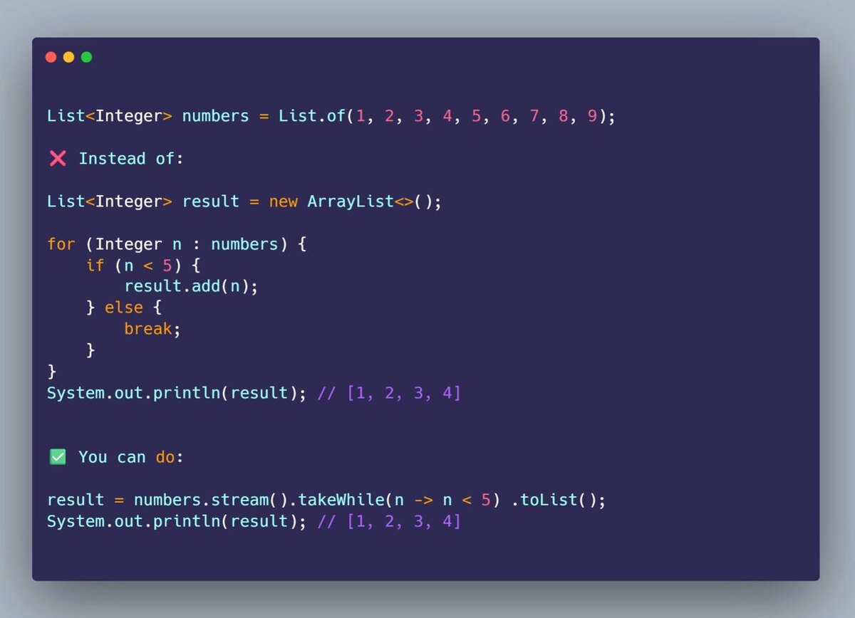 💡 Java tip: Начиная с Java 9 можно использовать Stream.takeWhile() для удобного «среза» элементов в потоке — пока выполняется условие. Это простой способ остановить обработку списка в нужный момент, не перебирая весь поток. #Java #JavaDev