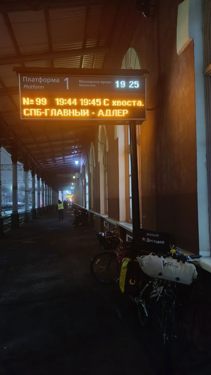 Ну что погнали??? Крути педали! А точнее упаковывай 🚲велосипед в тамбуре. Да! Заранее разбирать и упаковывать мы не стали, всё просто. Раньше провоз в багажном купе стоил чуть больше 300₽, а сейчас более 800₽. Вы просто вникните в такое бешеное повышение цены. Какой подарок 🎁нам сделает РЖД после Нового года в повышении цен на билеты? Дак вот за такую цену к вагону мы подъезжаем на велосипеде, потому что никогда не знаешь где окажется твой вагон и идешь 4-5 вагонов обязательно, ну уж 🚫нет... Теперь только так. В тамбуре хватает места, чтоб сложить стопкой велосумки, снять колесо с велосипеда и засунуть его в чехол и также со вторым велосипедом. Быстро, просто и удобно. Если стоянка хотя бы 5 минут, то можно успеть и до посадки это сделать, ну или мы уже набили руку. Вобщем так, просто супер и не надо ничего носить! Теперь двое суток едем до Горячего ключа! Да, ГК любимое место высадки в южном направлении! И день длинне там на пару часов, чем в Питере
