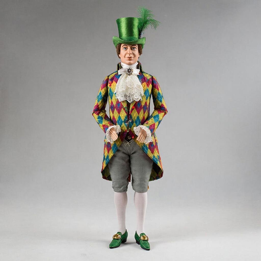 Зеленые бархатные башмаки с огромной золотой пряжкой, в тон им мягкая шляпа с атласной лентой, короткие, чуть пониже колен, штаны, нарядные чулки из-под них, кружевное жабо с милой брошкой и - камзол. Ах, какой замечательный камзол! Бархатные лоскутки , подобранные по цвету с особым изыском - от изумрудно-зеленого до золотисто-коричневого - образуют идеальной формы вытянутые ромбы. Цвета плавно переходят из одного бархатного ромба в другой, будто капля драгоценного масла скользит по ткани, а луч солнца играет с ней и создает дивную сияющую дорожку. Невозможно не звглядеться на такую красоту! Да, Кукольник, ты очень хорош собой! Стоп, а почему это он кукольник? Разве так кукольники одевались в старину? Кукольник - он ведь кто ? - он ремесленник! Сидит в своей маленькой каморке -мастерской, работает не покладая рук, а работа -то у него как раз пыльная - тут тебе и опилки, и краски, и лоскутки всякие , ниток обрывки. Какой тут камзол? Тут фартук широкий нужен, рубаха свободная, чтоб не мешалась в работе. А этот вон какой франт! И все же он кукольник - сказано, значит, так оно и есть.