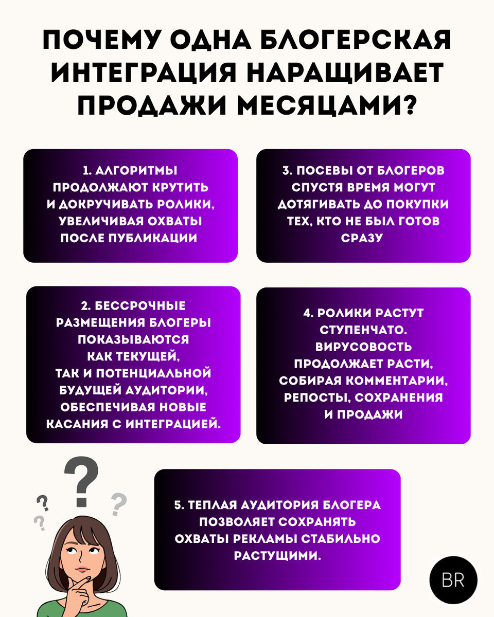 📢 Привет, меня зовут Светлана. Я основатель блогерской сети Barter Room 👉 https://t.me/mediaROOMblog Представьте: блогер опубликовал ролик сегодня. Часть аудитории увидела его в день выхода. Другая часть - через 3-7 дней, когда алгоритмы докрутят охваты или когда люди догонят ленту. Кто-то наткнется на ролик через пару недель через поиск, рекомендации или репосты. Весь этот период контент остается доступным и продолжает собирать просмотры и реакции, а значит, создает новые касания с вашим продуктом и дотягивает до покупки тех, кто не был готов сразу. Комментарии, репосты, отметки друзей - это растущая «обертка доверия», которая дополнительно повышает конверсию. А еще, блогеры не сидят на месте: они закупают трафик, делают коллаборации, участвуют в взаимных интеграциях - и тем самым постоянно расширяют свою аудиторию. Новые подписчики приходят в блог и продолжают видеть уже опубликованные ролики, включая вашу интеграцию. Одна публикация «работает» на все будущие волны трафика блог