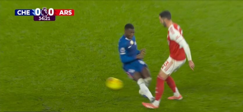 С первых минут было много борьбы, стыков, что привело к тому, что к 13 минуте команды получили 3 желтые карточки, 2 карточки было показано игрокам Арсенала - Мартину Зубименди и Кристиану Москере, одна игроку Челси - Марку Кукурелье. Повлиял на игру эпизод на 34 минуте матча, Мойзес Кайседо пошёл в стык и наступил на ногу Микелю Мерино, в результате чего оба оказались на газоне. Судья Энтони Тэйлор изначально показал желтую карточку игроку "синих", но после вмешательства ВАР изменил решение и удалил с поля полузащитника хозяев. После удаления игра проходила на равных, но без голов и, соответственно, команды ушли на перерыв при счёте 0:0. После перерыва вместо Эстевао вышел Алехандро Гарначо, у Арсенала же вместо Калафьори, получившего желтую карточку, появился Льюис-Скелли. Через 3 минуты хозяева заработали угловой и с подачи Риса Джеймса Чалоба затылком отправил мяч в дальний угол ворот. В ответ футбо