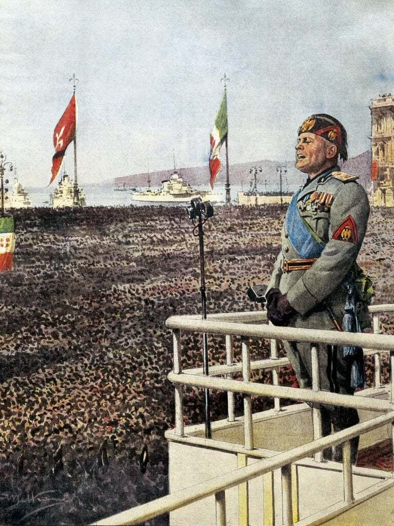 Дуче Муссолини обращается к жителям Триеста и всего мира в сентябре 1938 г. Ахилл Бельтраме