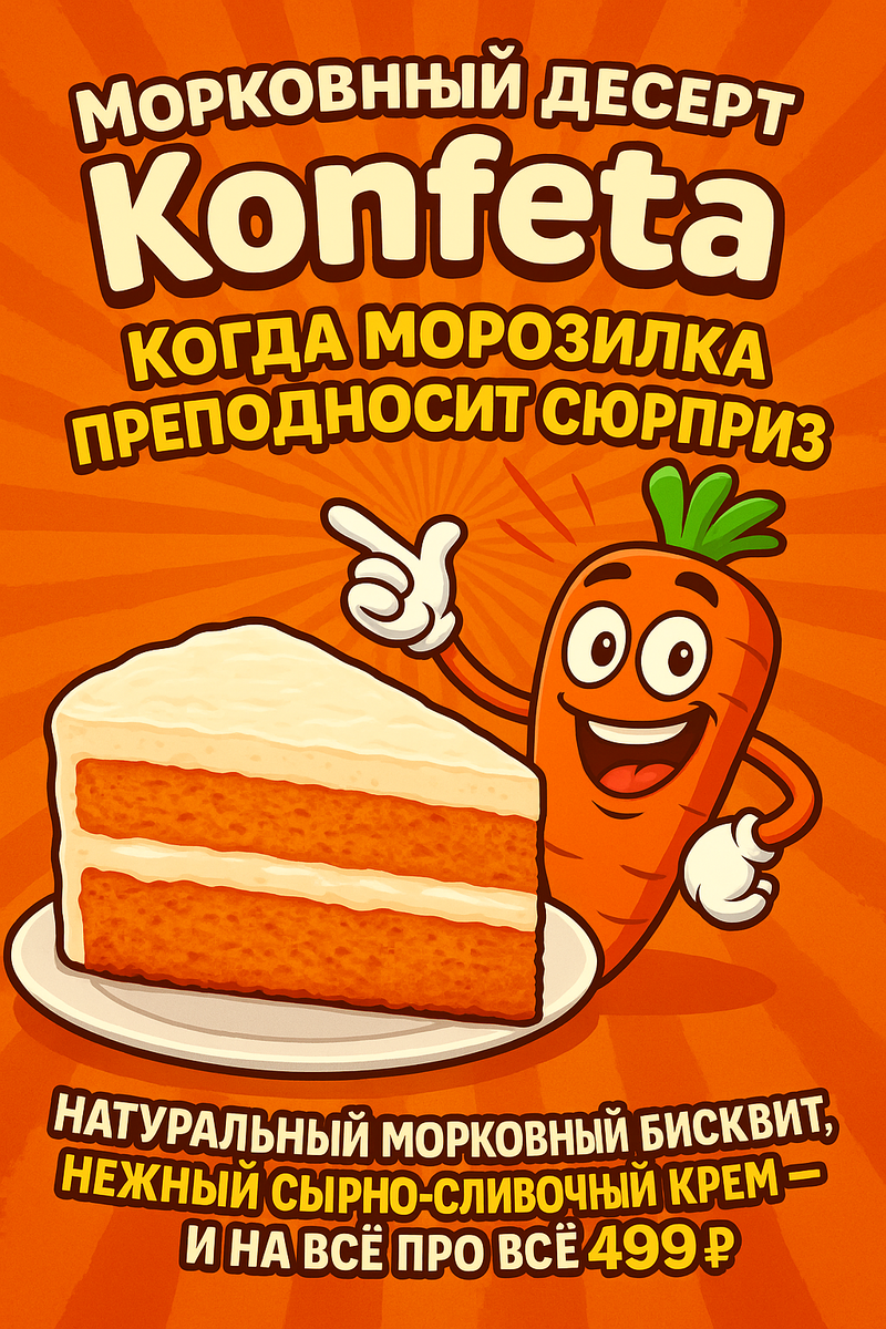 Заскочил тут на днях в «Чижик» за продуктами — как всегда, планировал быстро пробежаться, взять то что надо и уйти. Ага, как же! Стою у морозилки с замороженными десертами, смотрю — контейнер какой-то Konfetia морковный с сырно-сливочным кремом 500г. Ну я и подумал: "Морковный торт в морозилке? Серьёзно?" 😄 Обычно же морковные десерты продают в свежем виде, а тут — бац — и замороженный. Интересно стало, взял на пробу за 499 рублей. Производитель — ООО "ФРИКЕЙК", эти ребята вообще известны своими десертами под брендом Konfeta (они же Free Cakes).